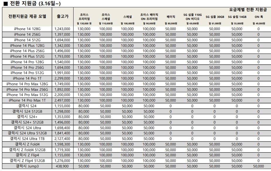 3월 16일자. lg 텔레콤 지원금