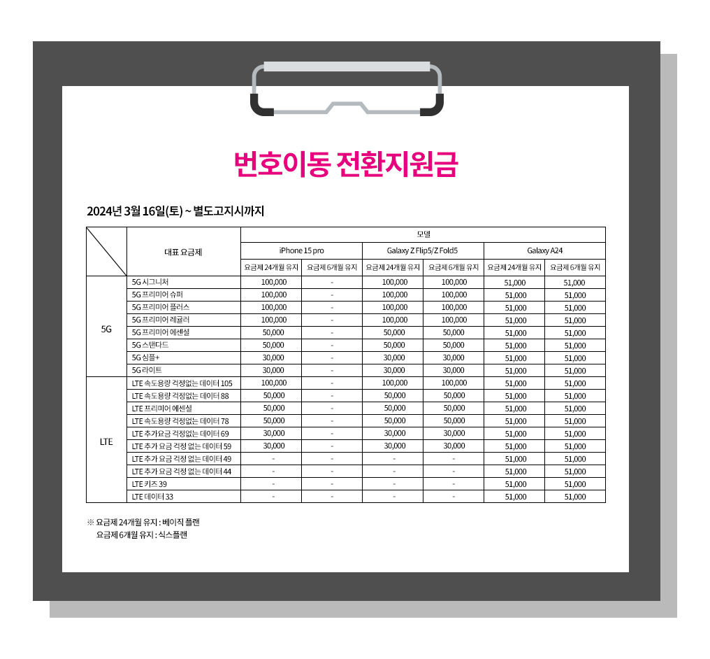 번호이동 전환지원금: SK텔레콤, KT, LG유플러스 모두 번호이동이나 기기 변경 시 전환지원금을 적용하여 시장에서의 우위를 점하려는 전략. 특히, 번호이동을 통한 전환지원금 제공이 본격 시행되기 전, 이번 전환지원금 상향 조정이 시장에서 더 많은 관심을 이끌어내고자 하는 노력의 일환으로 해석됩니다.