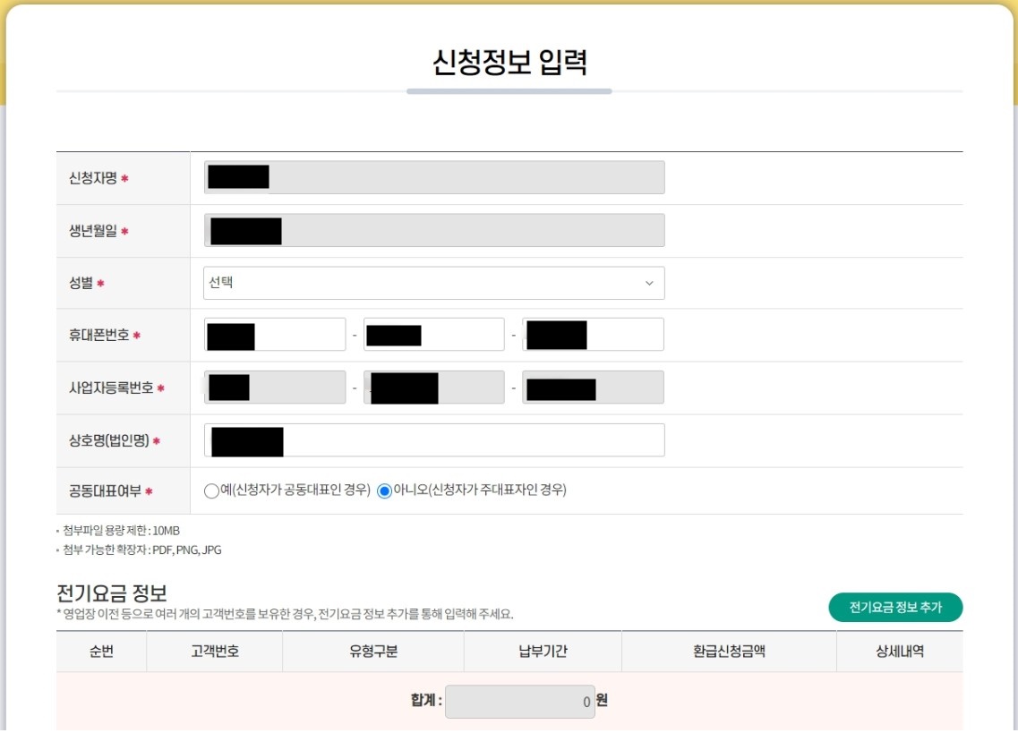별도로 서류 제출 필요는 없으며, 신청자 명, 사업자 번호, 전기 요금, 고객 번호 등을 소상공인 전기요금 특별지원.kr 홈페이지에 기입 후 온라인으로 신청이 가능합니다.