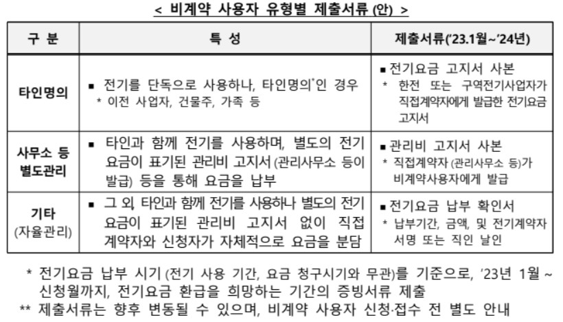 비계약 사용자는 건물주에게 전기 요금이 징수되는 경우 등 관리사무소를 통해 전기 요금이 적힌 관리비를 받는 경우를 의미합니다.