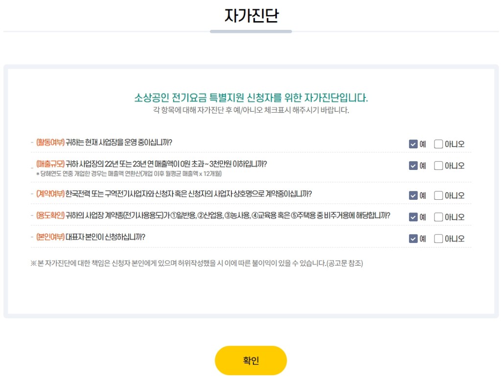 이어서 신청자에 해당하는지 자가 진단을 체크합니다.