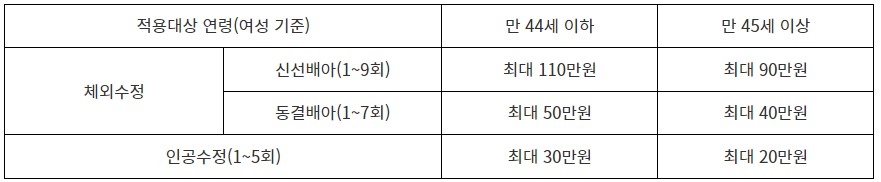 | 지원횟수 | 총 25회 | 신선+동결+인공수정 칸막이 폐지 |