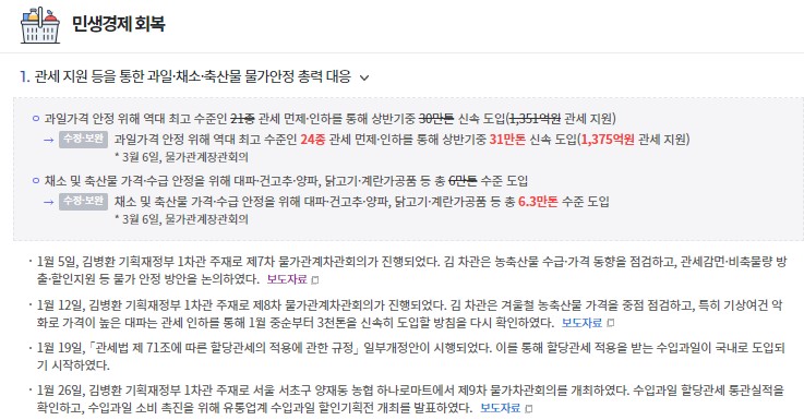 1. 관세 지원을 통한 물가안정 대응, 주요 생필품 용량 변경 시 정보공개 의무화, 다세대·다가구 주택 정책지원 강화 등이 포함됩니다.