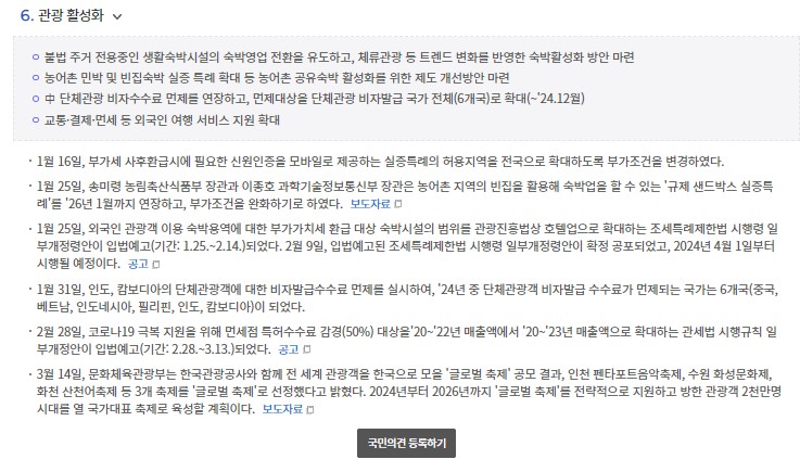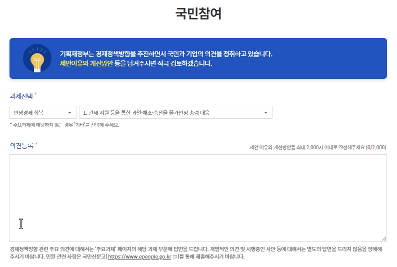 국민들이 직접 의견을 제시하고, 정책 개선에 참여할 수 있는 공간입니다. 여러분의 소중한 의견이 정책에 반영될 수 있어요!