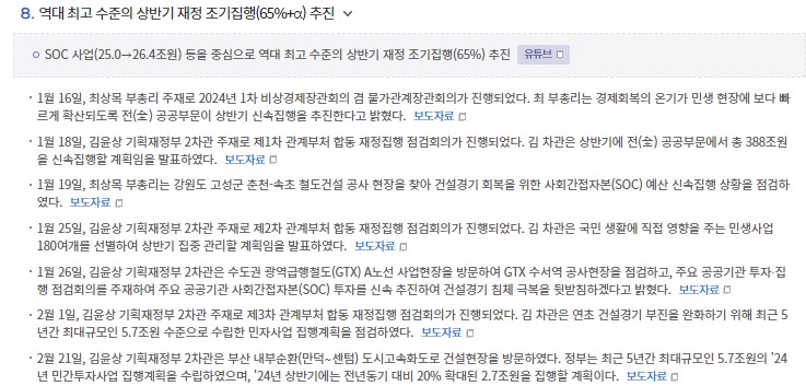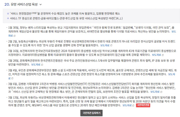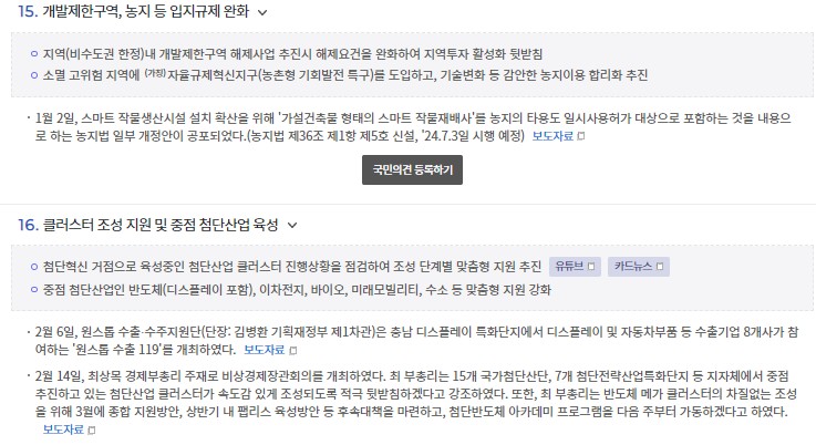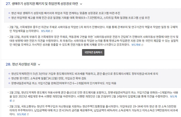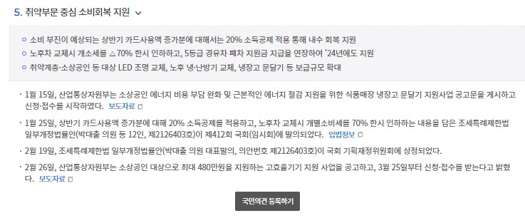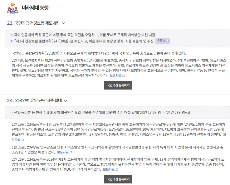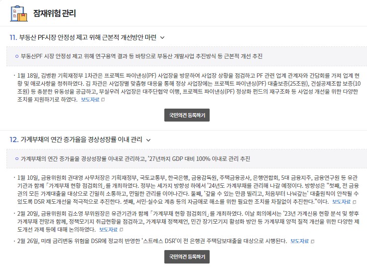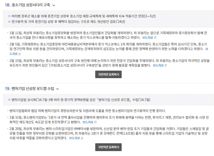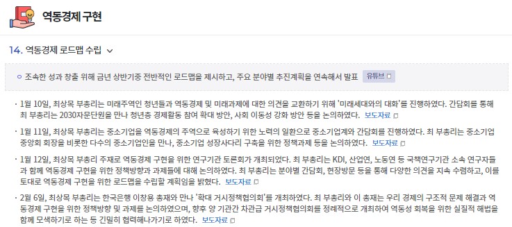 민생 경제 / 소상공인 / 위험 관리 / 미래 세대 등 구분을 확인해 보시면 현재 정책 진행 방향에 대해서도 확인 가능합니다.
