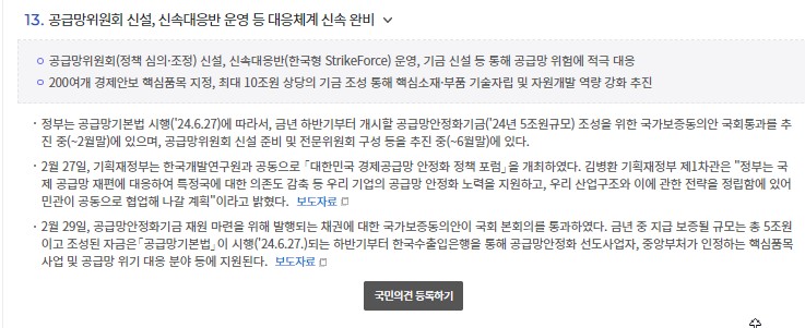 국민 누구나 이 플랫폼을 통해 경제정책 방향에 대한 의견을 제시하고, 정책 개선 아이디어를 공유할 수 있습니다. 주요 과제는 국민 의견에 따라 수정 또는 추가될 수 있으며, 국민들의 적극적인 참여를 기다리고 있습니다.