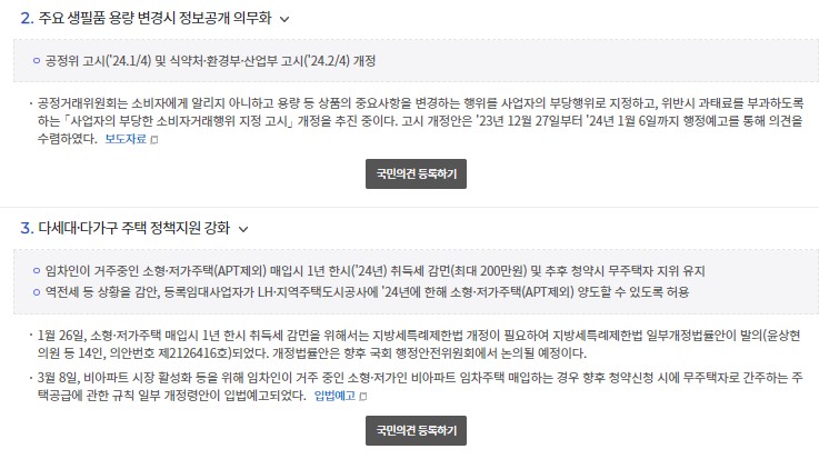 1. 관세 지원을 통한 물가안정 대응, 주요 생필품 용량 변경 시 정보공개 의무화, 다세대·다가구 주택 정책지원 강화 등이 포함됩니다.